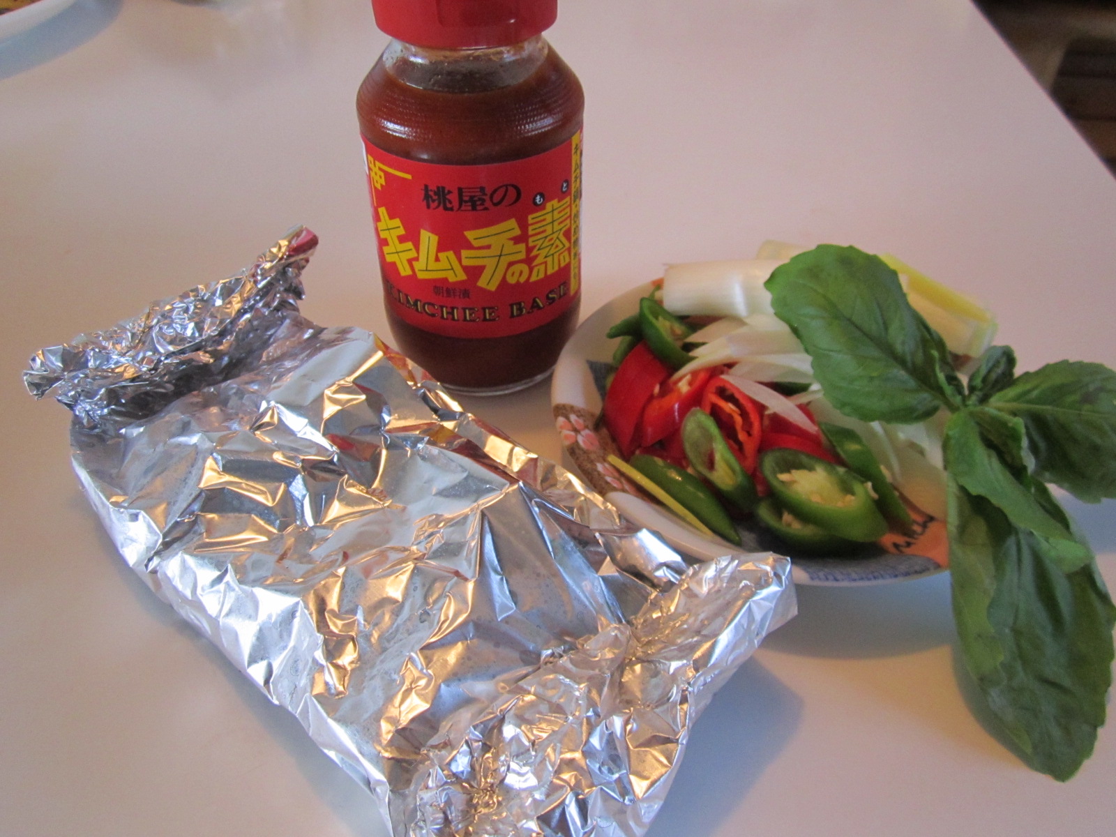 Pertama, air dijerang dalam panci, lalu bawang bombay, bawang putih, cabe merah, cabe hijau ditumis sebentar dengan minyak sedikit utk menghilangkan bau mentahnya….setelah layu, masukkan kedalam air yang mulai mendidih. Lalu masukkan kimchi base nya..mulai 1 -2 sendok makan dulu. Sementara kuah dipersiapkan, jangan lupa steamm, seared atau goreng ikannya. Saya memilih mengukus ikan tongkol saya. Karena keterbatasan alat, saya poach dalam alumunium foil, menggunakan wajan anti lengket ( lihat gambar ).