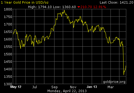 Inilah volatilitas harga emas yang terjadi dalam 1 tahun. Dengan jangka waktu yang lebih pendek, naik turunnya harga emas akan lebih terlihat. Hal ini mudah – mudahan bisa memberikan pandangan yang lebih sehat tentang emas dan pergerakan harga emas. Penurunan harga emas yang cukup tajam terlihat tanda – tandanya mulai bulan Maret 2013.
