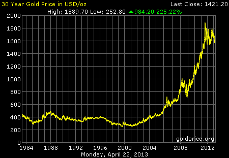1. Grafik harga emas 30 tahun terakhir ( sumber : goldprice.org )